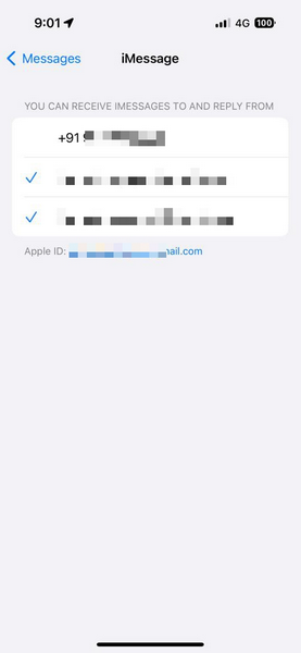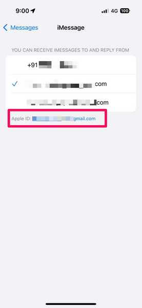 7.Luettelon alla kuitenkinLöydä Apple ID, jonka kanssa olet tällä hetkellä allekirjoitettu imessageenlaitteessasi. Tämän pitäisi olla erilainen kuin ensisijainen omenatunnuksesi, jota on käytetty kirjautumaan iCloudiin.