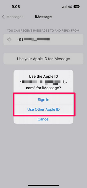 11.Oletusarvoisesti iPhone antaa sinulle mahdollisuuden allekirjoittaa uudelleen edelliseen Apple ID -sovellukseen IMESSAGE: lle. Jos tämä ei ole Apple -tunnus, jota käytetään iPloudiin iPhonessa,Voit napauttaa käytä muita Apple ID -vaihtoehtoaTarjolla olevalla kehotuksella käyttää Apple ID: tä, joka liittyy tällä hetkellä iPloudiin iPhonessa.
