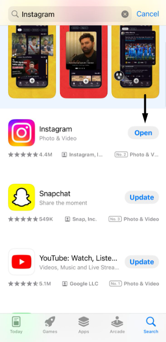 2.NapauttaaHakuVaihtoehto, valitseInstagramHakutuloksista ja napauta sittenPäivittääsen vieressä. Jos et näe päivityspainiketta, se tarkoittaa, että asennettavissa olevia päivityksiä ei ole.