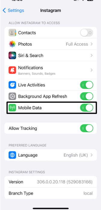 Voi olla mahdollista, että Instagram -mobiilitiedot eivät ole käytössä, minkä vuoksi Instagram -sovelluksen viestit eivät toimi. Tällöin ehdotamme sinuaVarmista, että mobiilidata on käytössäiPhonellasi. Voit noudattaa alla olevia vaiheita niin: