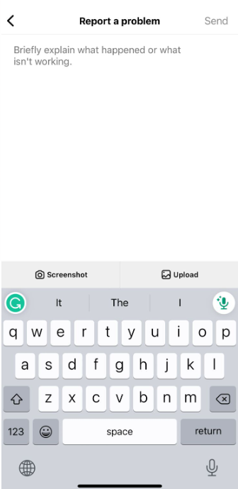 6.Selitä seuraavassa näytöllä Instagramilla koettava ongelma ja napauta sittenLähettääpainike. Voit myös kiinnittää kuvan napauttamallaLadatataiKuvakaappausalareunassa.