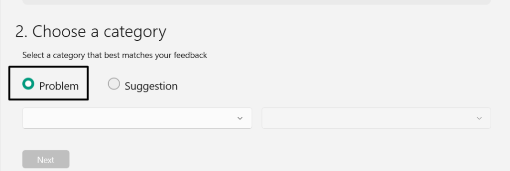3.ValitseSeuraavaksi-painiketta, valitseOngelma-valintanappia ja valitse sitten ongelmaluokka.