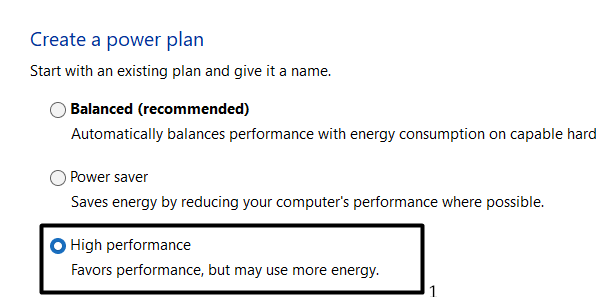 3.UnderLuo tehosuunnitelma, valitseKorkea suorituskykyvaihtoehto ja napsautaSeuraavaksi-painiketta.