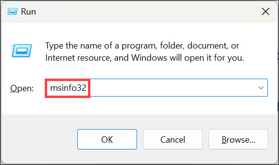 1.Paina Windows + R avataksesiSuorita ohjelma, tyyppimsinfo32siinä ja painaAnna avain.