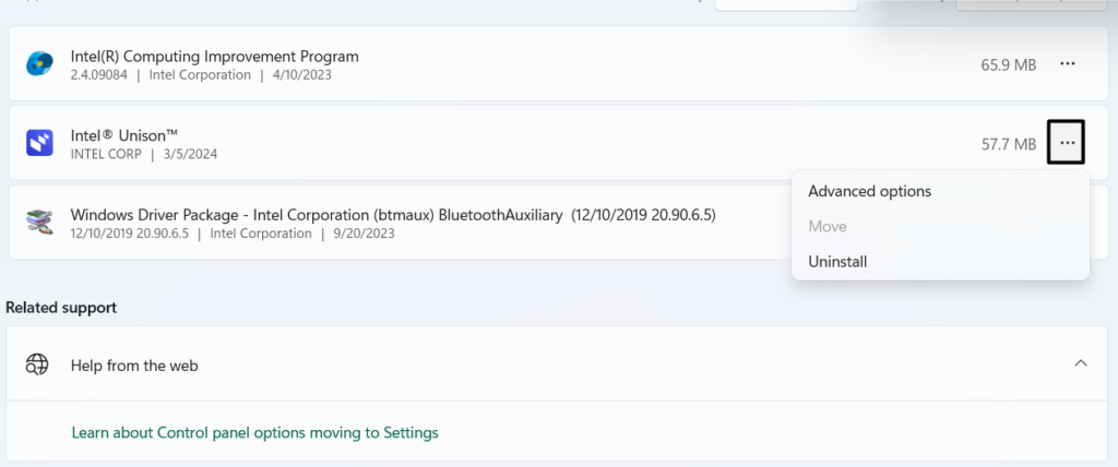 3.SiinäAsennettuja sovelluksiaIkkuna, etsiIntel Unisonsovellus ja napsautaKolme pistettä (…)sen vieressä.
