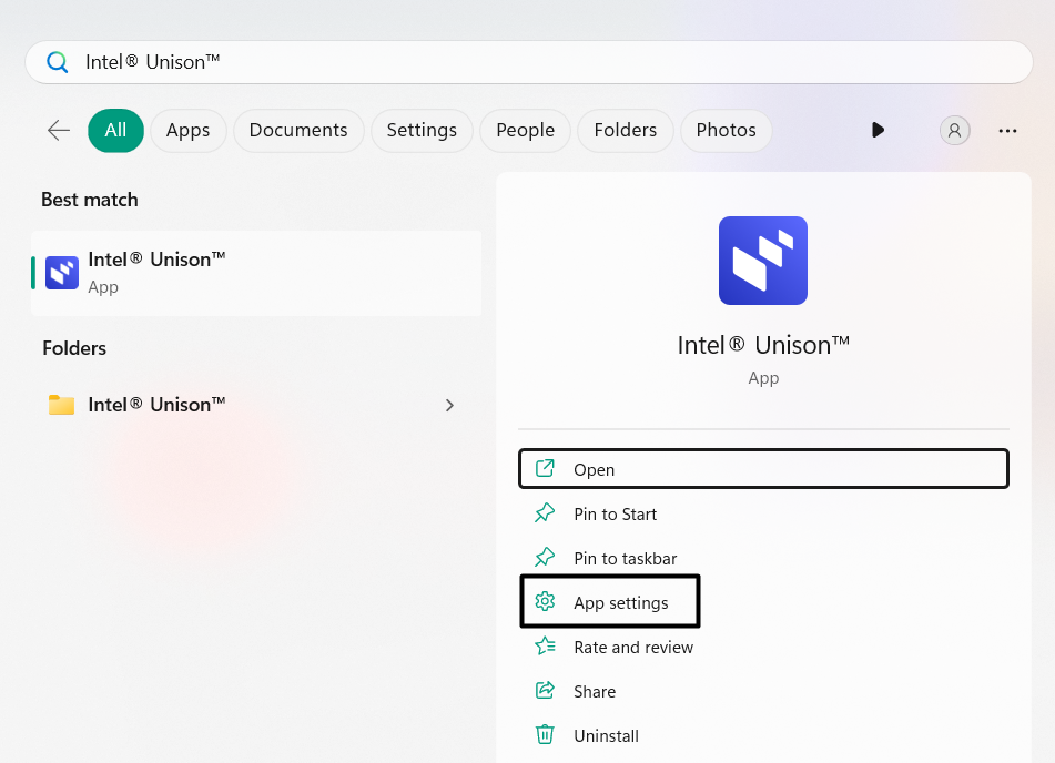 1.SiinäWindows -hakukenttäkirjoittaaIntel Unisonja valitseAsennuksen poistaminenVaihtoehto tuloksissa.
