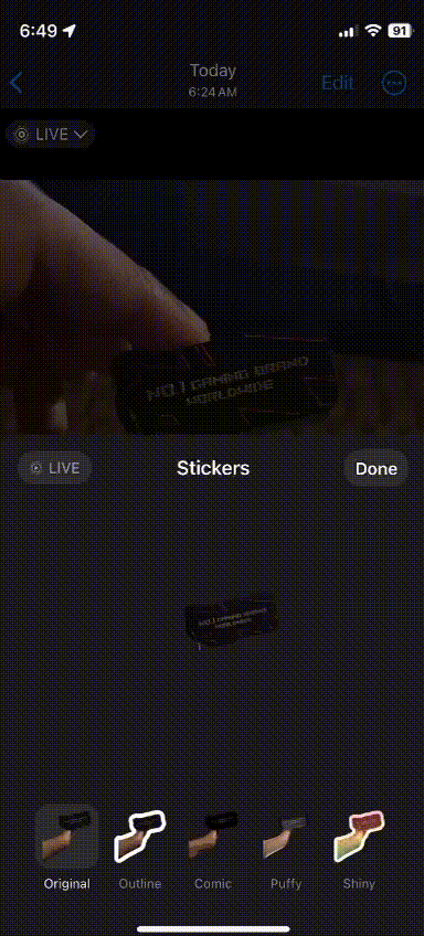 Kun avaat Add Effects -käyttöliittymän live -tarraan, jonka olet luonut iPhoneen iOS 17: ssä, saat neljä lisävaikutusta -Hahmotella-Koominen-PulleajaKiiltävä. Voit napauttaa kutakin näistä tehosteista lisätäksesi ne tarrasi.