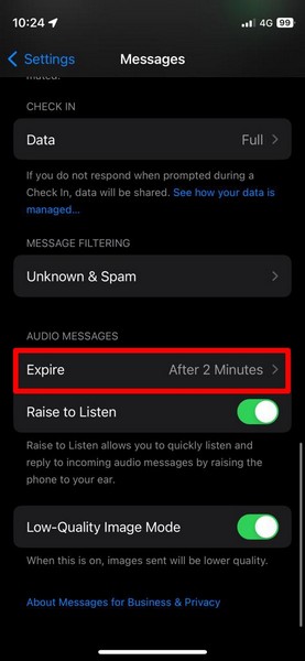 Yksi temppuista, joka on osoittautunut tehokkaaksi puheviestin toimimattomuuteen liittyvässä ongelmassa iPhonessa iOS 17:ssä, on, jos ääniviestin vanhenemisasetuksena on Ei koskaan.