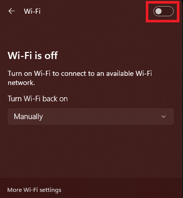 Seuraava lisäysohjelmiin liittyvien vianetsintämenetelmien luetteloon on Wi-Fi: n kytkeminen päälle ja pois päältä. Se auttaa tyhjentämään väliaikaisia häiriöitä tai virheitä sekä Wi-Fi-yhteyden virkistämistä ja konfliktien ratkaisemista, joita voi tapahtua kannettavan tietokoneen Wi-Fi-sovittimen kanssa ja aiheuttaa ongelmia, kuten iPhone-hotspot-yhteyksiä, jotka eivät ole yhteydessä.