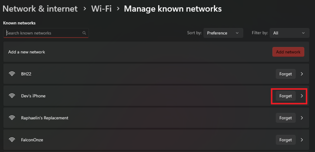 5.Etsi iPhone tunnetuista verkkoista ja napsautaUnohtaapainike.