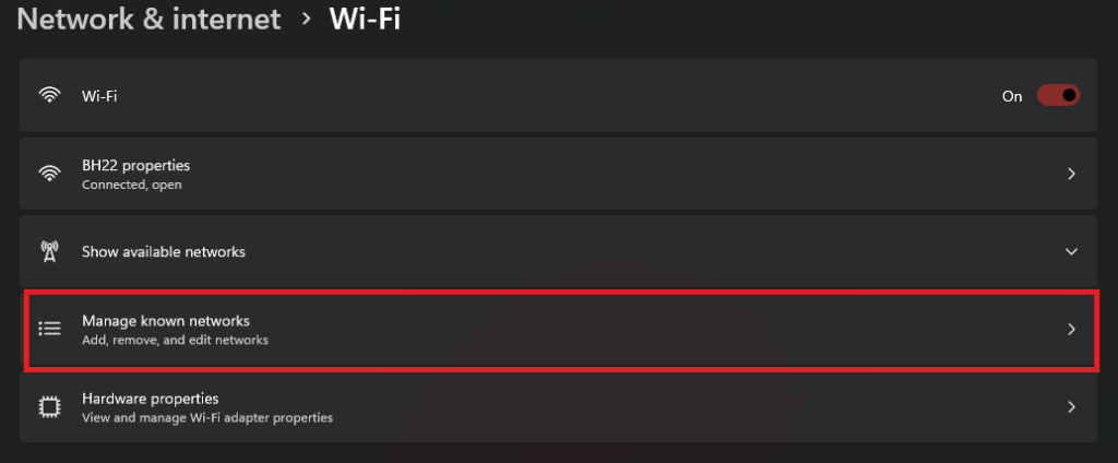 4. Napsauta Wi-Fi-osiossaHallitse tunnettuja verkkoja.