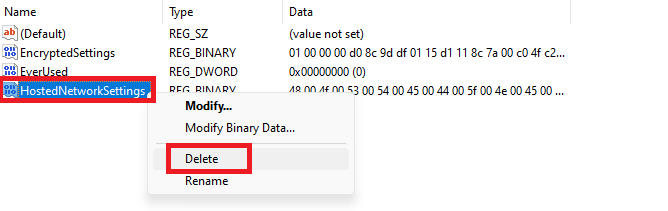 HKEY_LOCAL_MACHINESYSTEMCurrentControlSetServicesWlanSvcParametersHostedNetworkSettings3.Napsauta hiiren kakkospainikkeellaHostednetworksettingsTiedosto ja valitsePoistaavaihtoehto. Käynnistä tietokone uudelleen ja yritä muodostaa yhteyden iPhonen hotspotiin.