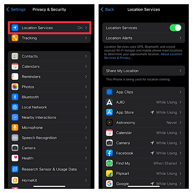 - Siirry iPhonen asetussovellukseen -> Tietosuoja ja suojaus -> Sijaintipalvelut.