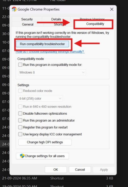 Joten käytä seuraavia vaiheita suorittaaksesi ohjelman yhteensopivuus vianmääritys sovellukselle, joka tuottaa ytimen.dll -virheen Windows 11 -tietokoneellasi tai kannettavalla tietokoneellasi, ja tarkista, onko sillä yhteensopivuusongelmia: