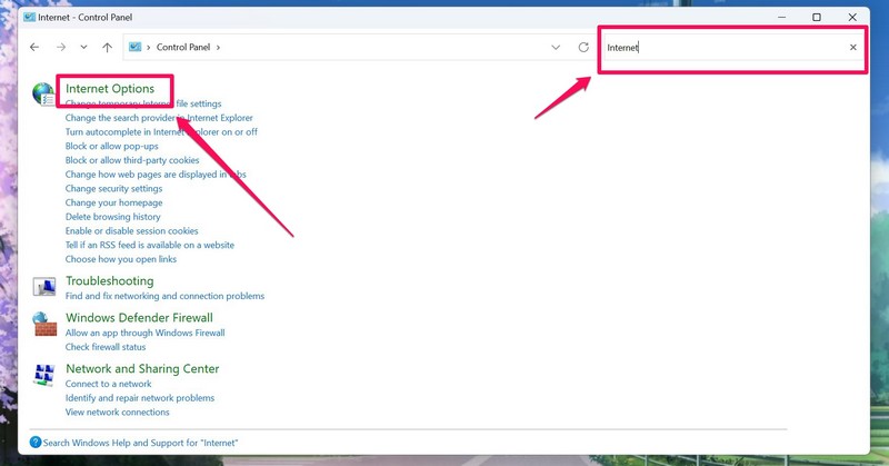 3.Nyt,käytä ohjauspaneelin hakupalkkialöytääInternet-asetuksetja napsauta mainittua vaihtoehtoa.