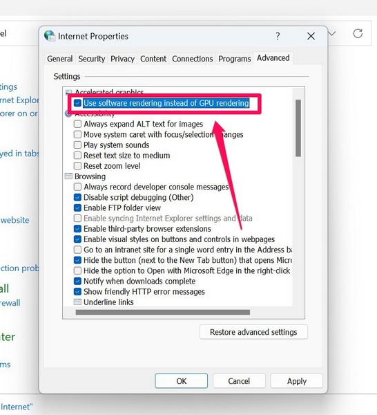 5.Tässä,valitse ruutuvartenKäytä ohjelmiston renderöintiä GPU-renderöinnin sijaanNopeutettu grafiikka -vaihtoehdon alla.