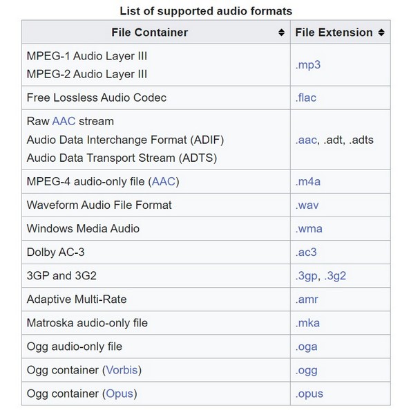 Katso alla olevasta kuvasta tietääksesi kaikki Windows Media Playerin tukemat äänitiedostomuodot.