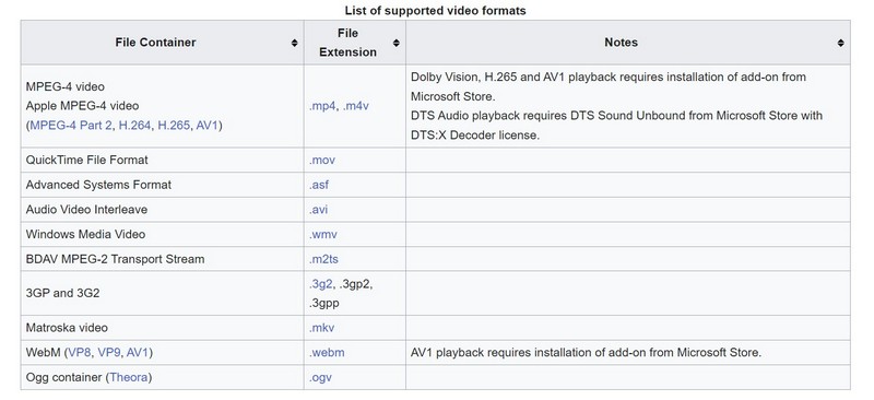 Windows Media Playerin tukemat videotiedostomuodot löytyvät seuraavasta kuvakaappauksesta.
