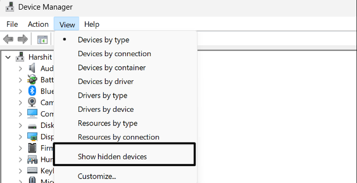 2.ValitaNäytä piilotetut laitteetAvattavasta valikosta kaikki piilotetut Windows -ohjaimet.