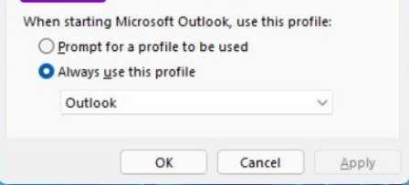 6.Kun olet luonut profiilin, valitse äskettäin luotu profiiliKun käynnistät Microsoft Outlookinvalikko ja painaKäytäasettaaksesi sen oletusprofiiliksi.