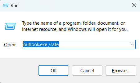 2.Tyyppioutlook.exe /safehakukentässä ja painaEnter.