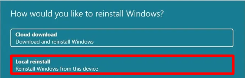 4.Valitse lopuksiPaikallinen uudelleenasennusvaihtoehto kohdassaKuinka haluaisit asentaa Windowsin uudelleen?kehote ja napsauta sittenNollaaaloittaaksesi tietokoneen palautusprosessin.
