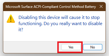 3.Napsauta hiiren kakkospainikkeella jtkMicrosoft Surface ACPI - yhteensopiva ohjausmenetelmän akkuja valitsePoista laite käytöstä.