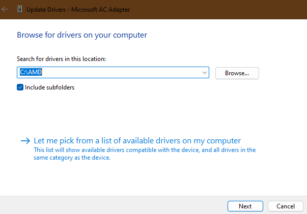 5.Voit myös päivittää ohjaimet manuaalisesti valitsemallaSelaa tietokonetta kuljettajillevaihtoehto. Kun olet napsauttanut tätä vaihtoehtoa, etsi päivitystiedosto tietokoneellesiSelataPainikkeen ja seuraa näytön ohjeita prosessin loppuun saattamiseksi.