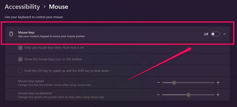 3.Napsauta nyt kytkintäHiiren näppäimetvaihtoehtopoista se käytöstäWindows 11:ssä.