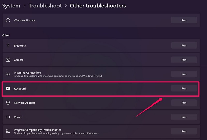 4.EtsiNäppäimistövaihtoehto seuraavassa vianmääritysluettelossa ja napsautaJuoksepainiketta sen vieressä.