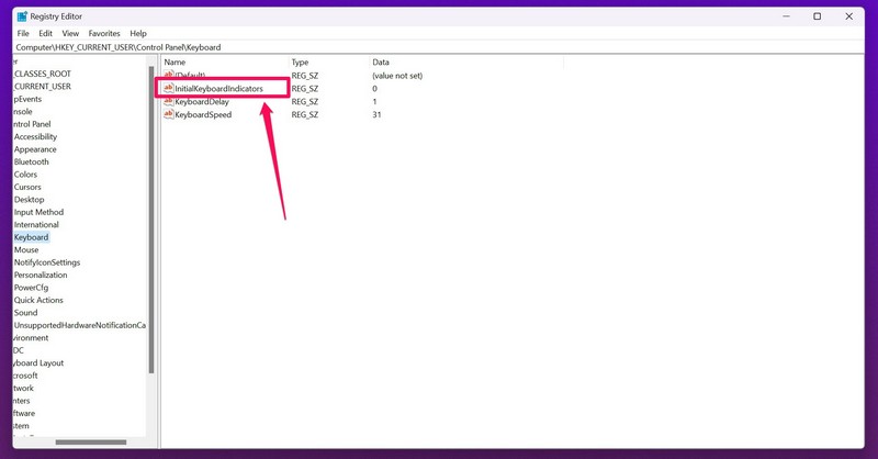 5.Etsi ikkunan oikeasta paneelistaInitial Keyboard Indicatorsrekisteriavain ja kaksoisnapsauta sitä.