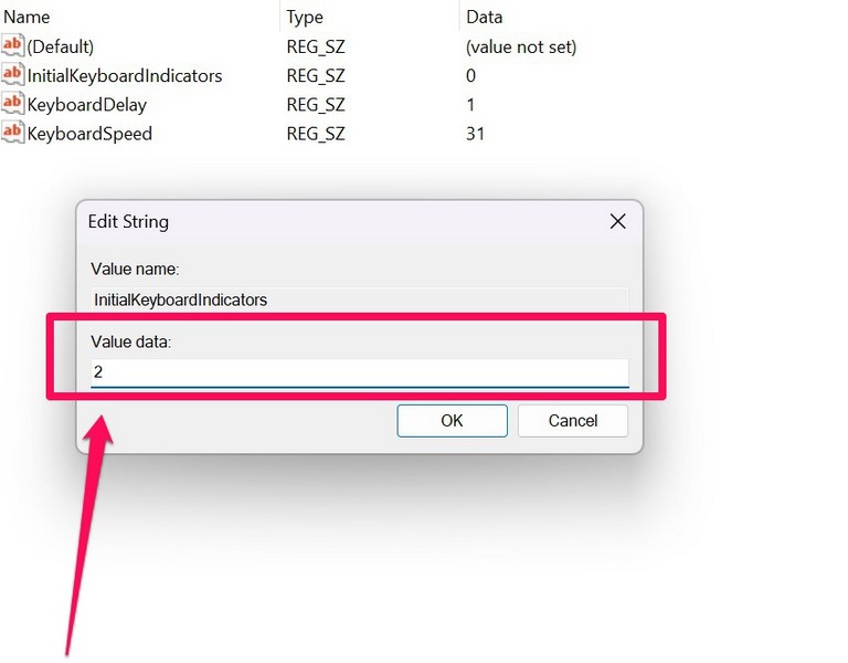 6.Muuta Muokkaa merkkijonoa -ikkunassaArvotiedot arvoon 2ja napsautaOK-painiketta tallentaaksesi muutokset.