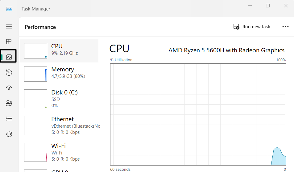 2.SiinäTehtäväpäällikköikkuna, meneSuorituskykyTAB ja valitse verkkotyyppi.