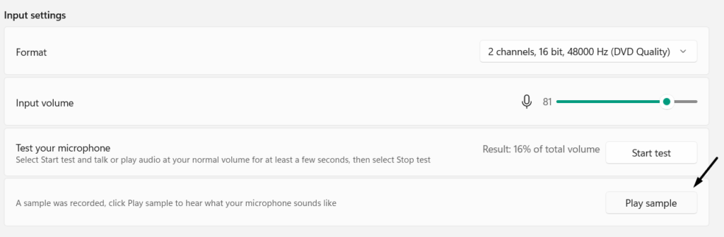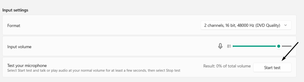 4.Kun olet valmis, napsautaAloitustestiPainike vieressäTestaa mikrofonitestin suorittaminen.