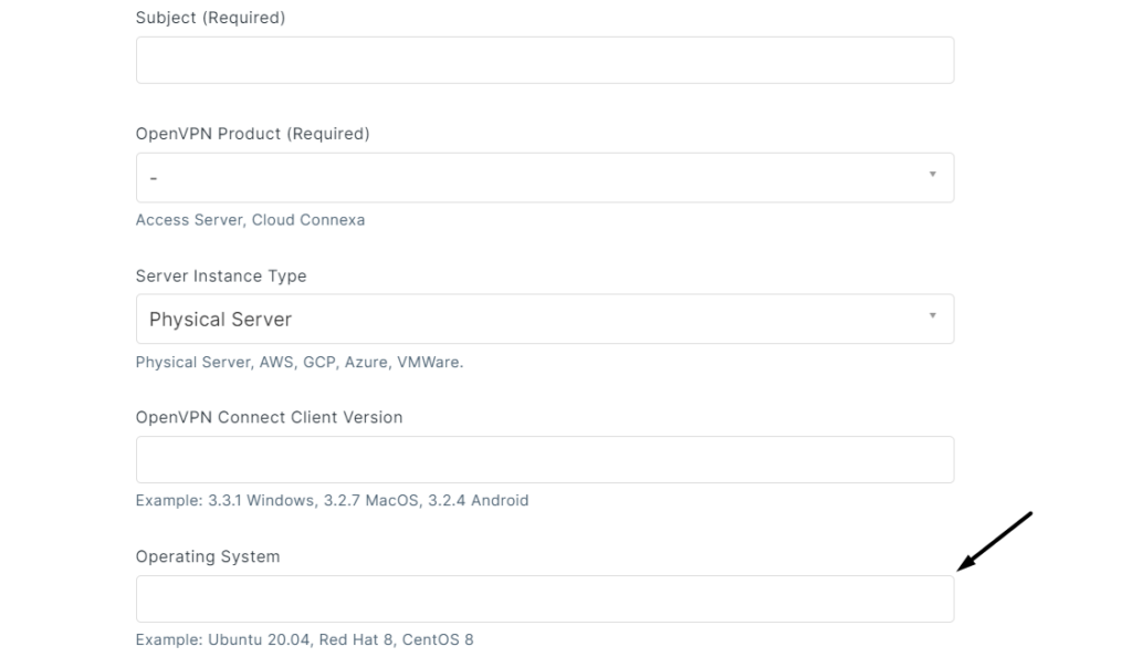 4.Valitse oikea vaihtoehtoOpenVPN -tuote (vaaditaan)jaPalvelin ilmentymän tyyppivalikko.