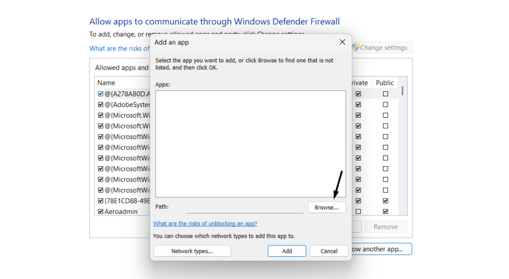 3.SiinäLisää sovellusIkkuna, napsautaSelaa…ja siirry sijaintiin, jossa VPN tallennetaan.