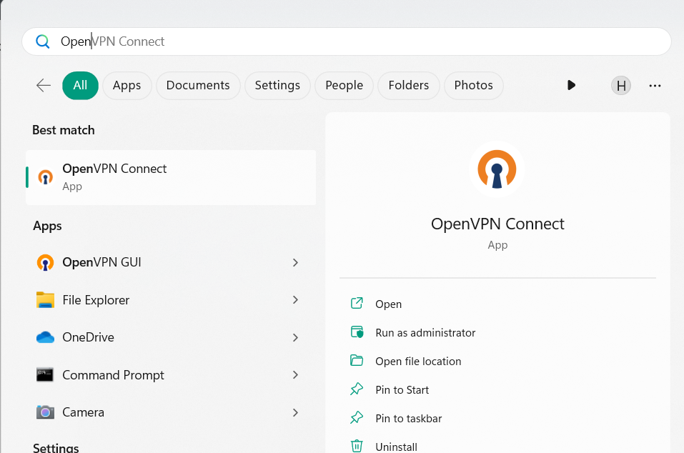 1.SaadaWindows -hakukenttäWindows 11 -tietokoneellasi ja kirjoitaOpenVPN Connectsiinä.