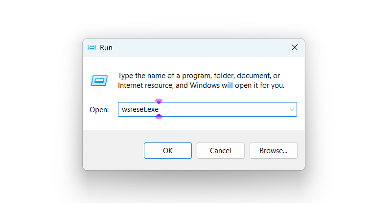 2.SiinäJuoksulaatikko, kopioiwsreset.exeJa sitten painaKirjoittaaMicrosoft Store -välimuistin poistaminen.