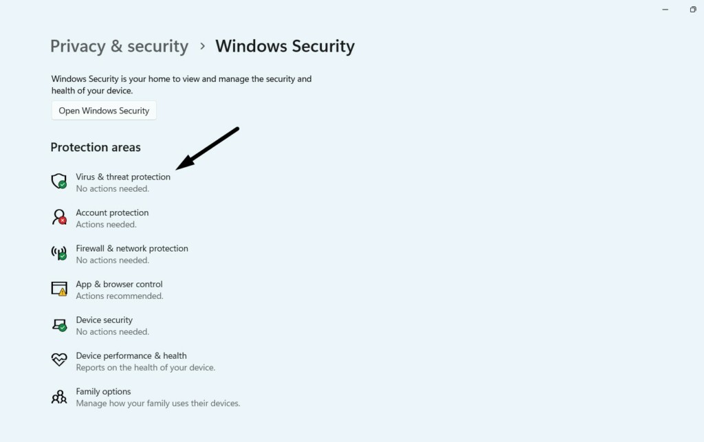 1.AvaaWindows Security -sovellusja valitse vasemmasta valikostaVirus- ja uhkien suojaus.