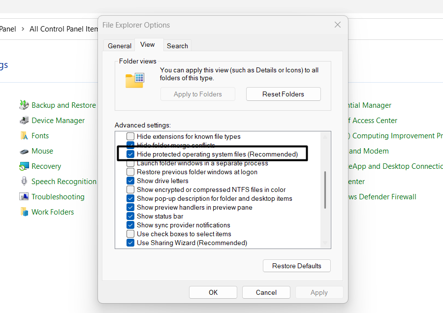 3.SiinäNäkymävälilehti, poista laatikko valintaPiilota suojatut käyttöjärjestelmätiedostot (suositeltu).