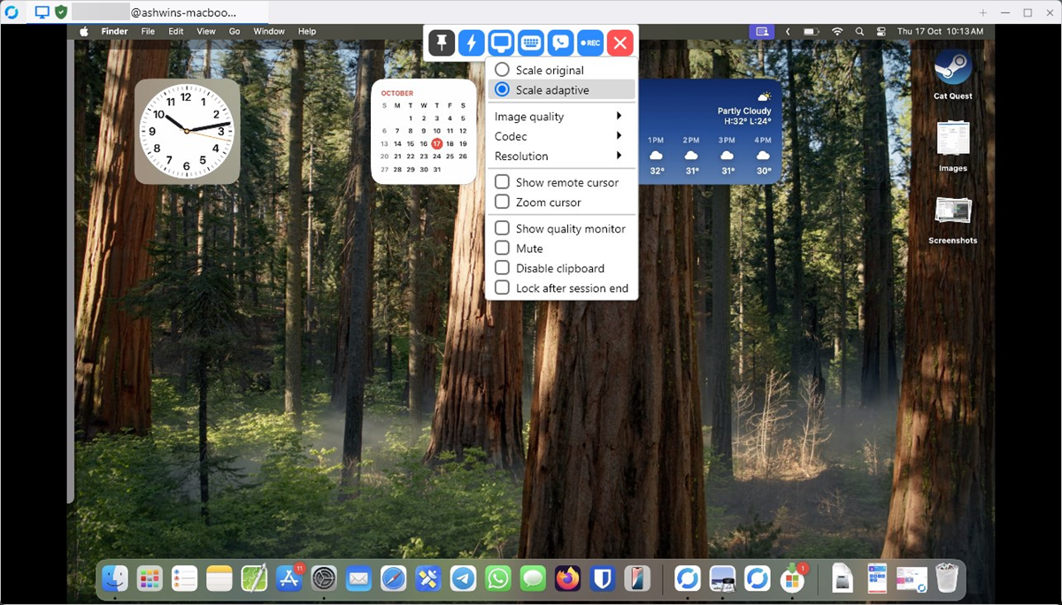 Nyt on vielä yksi ongelma, jonka sinun on ehkä korjattava. Macin näyttö voi näyttää siltä, että se on zoomattu. Korjaa tämä napsauttamalla Nuolen nuolikuvaketta Rustdesk -palkissa näytön yläosassa. Napsauta Monitor -kuvaketta päästäksesi näyttöasetuksiin ja valitse Scale Adaptive. Tämän pitäisi näyttää Mac -näyttö etätoimittajan oikeassa tarkkuudessa.