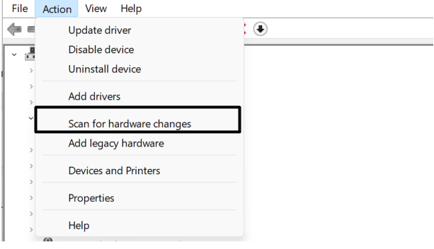 4.NapsauttaaToimintaPainike valikossa ja valitse sittenSkannaa laitteistojen muutoksistasiitä.