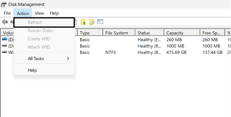 Yksi tapa korjata SD-kortinlukija ei toimi Windows 11:ssä onpäivitä Disk Manager -apuohjelma, koska saattaa olla mahdollista, että se ei tunnistanut muistikorttiasi joidenkin ongelmien vuoksi. Joten harkitse Levynhallintaohjelman käynnistämistä uudelleen seuraavien ohjeiden mukaisesti: