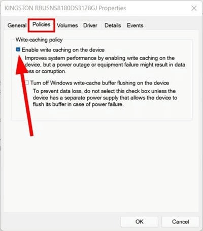 4.VuonnaKäytännöt-välilehti, varmista, että ruutu on vieressäOta kirjoitusvälimuisti käyttöön laitteessaon valitsematon.