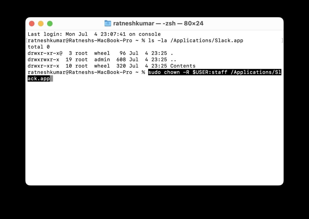 Jos näet edelleen ongelman, on aika vaihtaa Slack-sovelluksen omistajuutta MacBookissasi. Tämä tapahtuu, kun tiedoston /Applications/Slack.app omistaa pääkäyttäjä, ei käyttäjä. Voit yksinkertaisesti muuttaa sovelluksen omistajuutta käyttämällä chown terminal -komentoa noudattamalla alla olevia ohjeita.