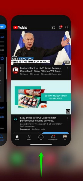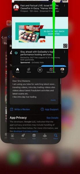 Toinen asia, joka voi luoda "jotain meni pieleen, napauta uudelleen uudelleen" -virheen iPhonen YouTube -sovelluksessa on tekninen häiriö itse sovelluksessa. Tässä tapauksessa voit kokeilla iPhonen YouTube-sovelluksen voiman sulkemista ja käynnistää sen laitteeseesi uudelleen.