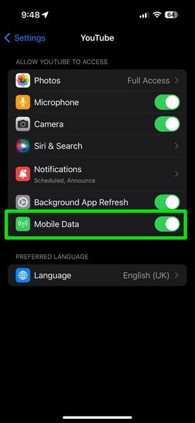 Joten välttääksesi itsesi löytämistä samanlaisesta tilanteesta, varmista, että YouTube -sovellus on sallittu mobiilitietojen suhteen iPhonessa. Voit seurata alla olevia vaiheita tehdäksesi sen: