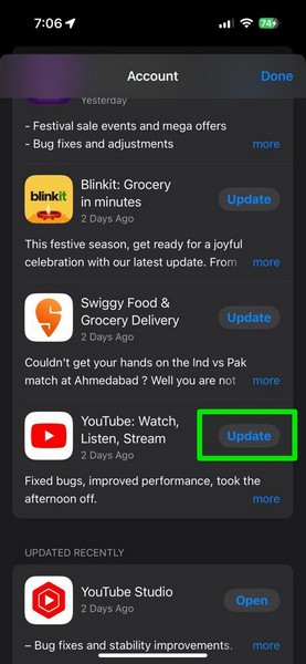 5.Jos löydät YouTube -sovelluksen päivityksen, napautaPäivityspainikeSen vieressä päivittää sovellus iPhonessa.