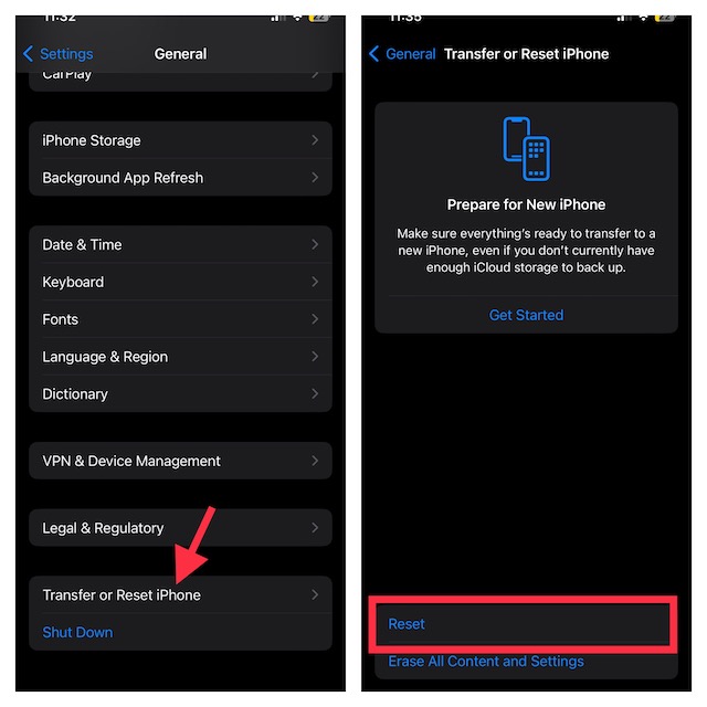 - Seuraavaksi napautaSiirrä tai nollata iPhoneja sittenNollata.