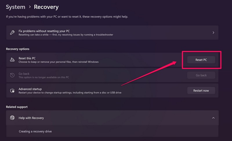 3.Napsauta nytPalauta PC-painiketta Palautusasetukset-osion Palauta tämä PC -asetuksen vieressä.